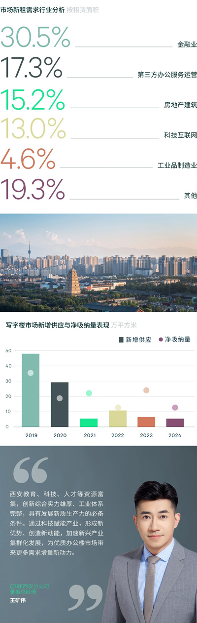 需求引擎動能煥新,二級市場格局轉變。需求層面,來自金融類企業的需求占比為30.5%,領跑甲級寫字樓需求來源。隨著西安金融服務科技創新的體制機制建設進程的加速,愈加多元的金融需求及愈發活躍的經濟活動推動金融機構的持續擴容,繼而衍生更多如銀行、證券、基金等傳統及新興金融企業的辦公需求。上半年,銀行類金融企業的續租擴租及升級需求強勁,占比超過20%,推動金融行業新增需求重回主導地位。此外,如證券、基金等傳統金融類企業的升級擴租需求也有所回升。其次,來自第三方辦公運營商的新增需求位居第二,占比17.3%。上半年,提供“拎包入駐”服務的第三方辦公服務運營的新增需求持續走高。其中,以本土聯合辦公品牌的擴張最為矚目,占比9.4%。同時,隨著租戶對裝修等前置成本及租賃靈活性關注的升溫,一級租賃市場的樓宇業主紛紛試水,通過精裝部分空置面積打造自營靈活辦公空間或提供定制裝修服務等方式入局二級市場,逐漸形成業主自營空間、聯合辦公頭部運營商及本地運營商比肩并起的新格局。最后,來自房地產建筑業的新增需求占比15.2%,居第三。建筑工程類企業的辦公需求仍主導房地產建筑業的新租需求,占比12.1%。且以非本地中資的升級需求為主。