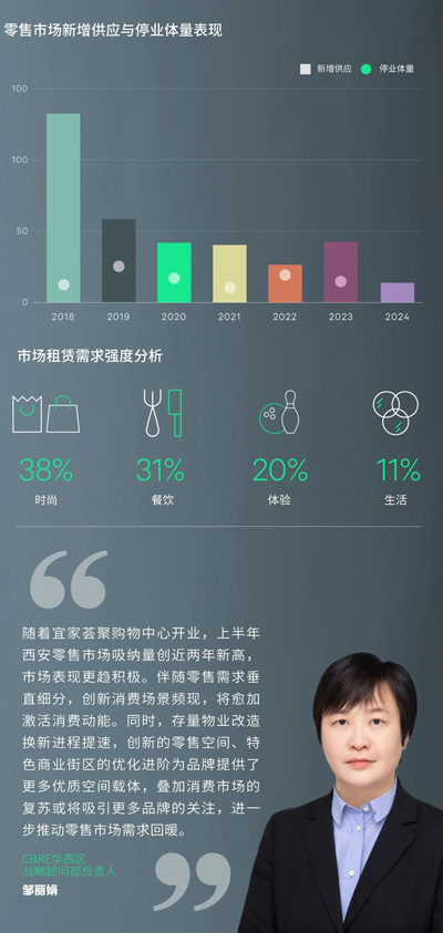 需求方面,服飾類需求重回活躍,推動時尚類零售業態主導市場需求,占比37.8%。消費者愈發注重個性化需求,驅動運營商深挖細分圈層,提供更垂直細分品牌選擇。上半年,迎合消費者個性需求的潮牌及本地買手店、專業運動品牌等持續加碼西安市場,均開出西安首店或拓展二店。與此同時,快時尚品牌分化加劇,在部分品牌再次拓展市場的同時更多品牌仍持續關店。其次,餐飲類品牌作為業主回填空置面積的主力軍仍保持活躍,占比31.0%。細分賽道品牌更迭加速,如本地連鎖品牌中的地方菜系品牌積極擴張。茶飲點心類品牌表現依舊搶眼,其中新式茶飲品牌及甜品類品牌新意不斷,首店頻現。來自體驗類新增需求仍保持穩定,上半年新租占比19.9%。“解壓經濟”、“悅己經濟”、“養生經濟”崛起推動如脫口秀劇場、妝造室、養生館等體驗細分業態新增需求持續上升,成為體驗類業態需求增量的新動力。