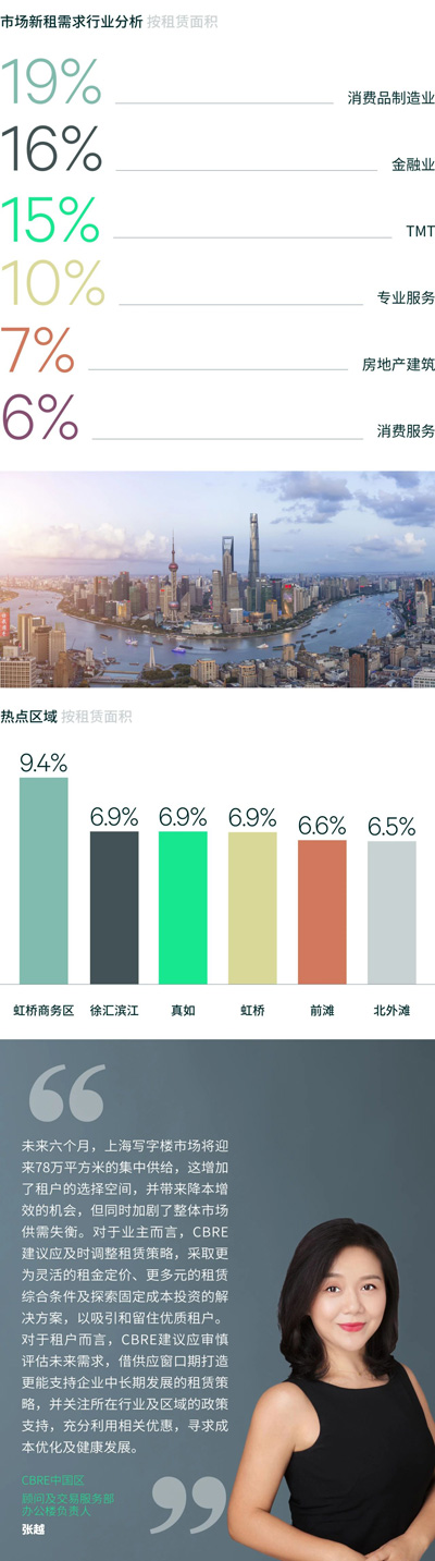 區位表現來看,虹橋商務區受多家汽車企業搬遷需求帶動,租賃活躍度較往年明顯提升;徐匯濱江子市場中,消費服務業(教育)為需求主力;真如子市場去化表現穩定,TMT相對活躍;虹橋子市場需求穩中有升,主要來自消費品制造業及電商;前灘子市場去化則主要來自金融業及工業制造業企業的大面積成交。
