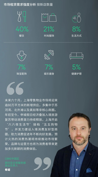 零售業態新租占比有所提升,其中服飾類需求占比21%,以戶外運動類品牌的活躍布局為引領,潮流女裝品牌與潮流設計師品牌線下布點亦較為活躍,中國首家WTAPS落址上海新天地,芮歐百貨迎來KKRIZIA、American Vintage及ANINE BING等一系列品牌首店進駐。此外,生活方式以及珠寶配飾品類需求亦較為顯著,分別占比8%和7%,配飾市集品牌amywrong阿米望全國首店在環球港開業。
