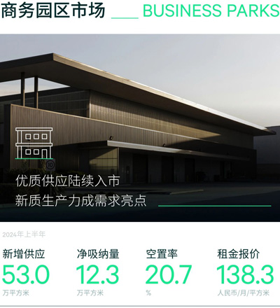 2024年上半年上海商務園區寫字樓市場迎來八個新增供應,集中在張江和金橋板塊,以及臨空和市北,共計53萬平方米,同比上升53%。二季度市場有所回暖,季度凈吸納量環比上升至7.6萬平方米,至此上半年累計凈吸納量12.3萬平方米,同比上升57%。集中供應推動當前空置率至20.7%,同比上行2.7個百分點。