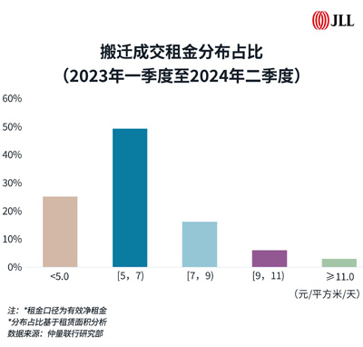 面對(duì)謹(jǐn)慎的市場(chǎng)情緒,新近竣工項(xiàng)目的業(yè)主在價(jià)格策略上釋放更大的議價(jià)空間,以此吸引租戶、提升入駐率,因此導(dǎo)致新竣工項(xiàng)目與成熟項(xiàng)目之間的價(jià)格差距逐漸擴(kuò)大。同時(shí),新竣工項(xiàng)目?jī)r(jià)格的“鯰魚效應(yīng)”促使成熟項(xiàng)目的業(yè)主更主動(dòng)地調(diào)整價(jià)格策略以適應(yīng)當(dāng)下的市場(chǎng)競(jìng)爭(zhēng)。根據(jù)成交租金的分布情況,仲量聯(lián)行觀察到接近3/4的成交租金集中在7.0元/平方米/天以下的區(qū)間內(nèi)。
