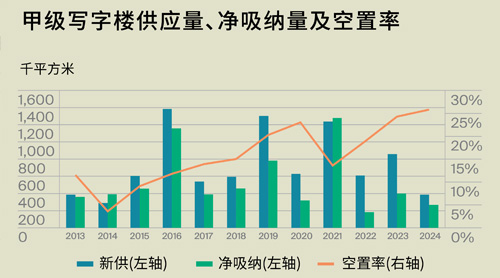 本季度,全市寫字樓市場呈現(xiàn)調(diào)整態(tài)勢,新增供應(yīng)大幅回落至3.7萬平方米。中海集團(tuán)后海總部大廈成為唯一的新增供應(yīng)。因需求疲軟疊加價(jià)格調(diào)整的邊際改善效用減弱,凈吸納量大幅回落至6.7萬平方米,進(jìn)而推動(dòng)全市空置率攀升0.4%至25.8%。