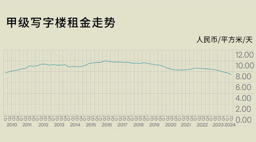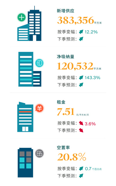 第二季度,全市甲級寫字樓的平均租金大幅下跌3.6%至每天每平方米人民幣7.51元。為了提高出租率,業主采用了以價換量的策略,導致本季度租金大幅下降。