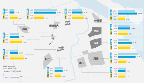 第三季度,上海產業園區在機器人行業需求提升的引領下,凈吸納量增至25.5萬平方米,創下自2022年下半年以來的單季新高。但此次回暖能否持續并形成趨勢性反轉,仍需進一步觀察。從區域分布看,市場需求呈現分化態勢,租賃活動主要集中在周康、金橋、張江及浦江等子市場。