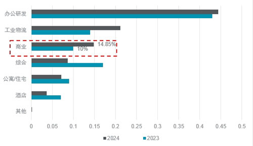 中國的零售市場也正在經(jīng)歷消費重構(gòu)及運營的大資管時代,追求品質(zhì)、社交、個性、體驗的消費需求正成為主流,這些需求倒逼消費場景不斷迭代升級。隨著基礎(chǔ)設(shè)施公募REITs擴容至消費基礎(chǔ)設(shè)施,零售物業(yè)投融管退閉環(huán)的形成也極大激發(fā)了投資者的投資意愿。戴德梁行的數(shù)據(jù)顯示,2024年,商業(yè)類項目的投資成交額占比由2023年的10%上升至14.85%(圖一),2025年趨勢仍將延續(xù)。