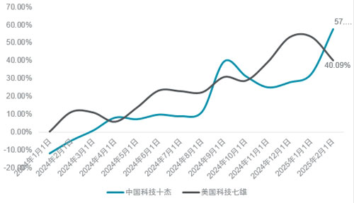 中國高科技產(chǎn)業(yè)在全球舞臺逐漸開始扮演引領(lǐng)者角色。投資者開始重新審視中國科技企業(yè)的價值,在資本市場,從2024年底開始,中國科技十杰在資本市場的表現(xiàn)亮眼,以2023年底為基準(zhǔn),十大科技類企業(yè)截止至2月底股價漲幅達(dá)57.39%(圖二)。