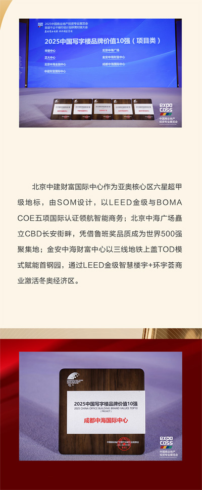 [提要]COOC中海商務旗下北京中建財富國際中心、北京中海廣場、北京中海金融中心、金安中海財富中心以及成都中海國際中心,榮獲2025中國寫字樓品牌價值10強,以優異的資產運營管理和商業生態體系構建能力成就業界典范。