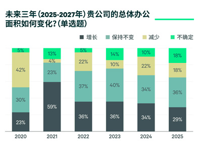 本次調(diào)查結(jié)果顯示,29%的受訪租戶計劃在未來三年增加辦公面積,為過去五年最低值,僅高于2020年。與此同時,選擇“減少面積”的租戶占比較去年也有所收縮,選擇“保持不變”的租戶占比上漲2個百分點(diǎn)至36%,這顯現(xiàn)出企業(yè)對未來房地產(chǎn)規(guī)劃的整體求穩(wěn)心態(tài)。