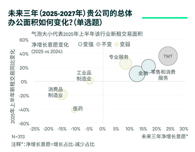 整體來看,凈增長意愿位于正區(qū)間內(nèi)的科技、消費(fèi)、金融和專業(yè)服務(wù)上半年貢獻(xiàn)新租交易面積73%,這些主力需求行業(yè)更積極的擴(kuò)張意愿有望支撐辦公樓凈吸納量在2025至2027年期間穩(wěn)步增長。