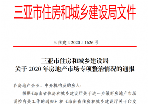 10月23日,三亞市住建局下文通報了該市房地產市場專項整治情況。本次專項整治共檢查在售樓盤60個、中介機構門店50家,約談開發企業 4家,下發整改通知書11份。從總體檢查情況看,三亞市房地產市場運行平穩,大部分開發企業和中介機構能夠依法依規經營并執行海南省房地產市場調控政策,但也存在個別企業違規銷售及個人違規購房等問題。