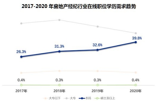 2017-2020年,房地產(chǎn)經(jīng)紀行業(yè)本科及以上人才需求占比由26.7%上漲到40.2%,房地產(chǎn)經(jīng)紀行業(yè)整體人才質(zhì)量提升需求迫切。
