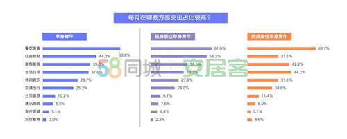 《報(bào)告》顯示,63.8%的單身青年表示每月在餐飲美食上的花銷占比較高,此外,住房物業(yè)、服飾美容、生活日用等方面也是單身青年的主要開銷。租房居住的單身青年在住房物業(yè)方面的開銷相對(duì)較高,而居住在自有房屋的單身青年則將更多的花銷放在餐飲、服飾美容及生活日用上,住房方面的花銷僅排在第四位。