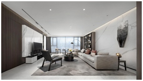 穿過玄關屏風之后,大氣朗闊的客廳空間豁然鋪開。方正有序的格局里,以深色格柵排列表達緊湊感,白淺紋巖板表現疏朗感,節奏清晰分明,進而打破單調界限。整面落地窗更將都市景觀融匯到客廳,帶來自然天際的仰望與現代夜景的璀璨。細鑒每件物品,都涌動著藝術靈性,極具先鋒雕塑感,精奢情調與中式水墨律動兼收并蓄。