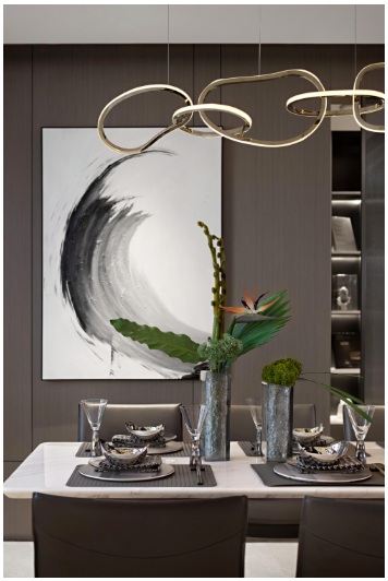 用餐區小到餐具的擺置搭配,大至掛畫的考究,都彰顯著高雅輕奢的氣質。華麗的金屬吊燈如躍動的音符,附著一家人齊聚進餐的歡聲笑語、杯盞晃動、光影交錯著漸變著,一曲愛與美食的家庭樂章就這樣欣然奏響,綿逸柔遠。