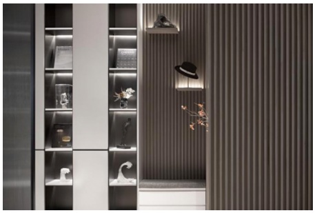 玄關作為一個家的序章,承載著傳遞初始印象的關鍵。這里大量運用深色天然木紋飾面,木材的溫潤結合冷峻的灰色大理石,既凜冽,更溫柔。采用半隔斷的方式達成過渡性質,以石材的延續形成與內部空間的溝通,自然引入。方圓有度,墨痕入織,幾抹暖花拂面,從步入的開始就已經拭去壓力,只得沉靜與向往。
