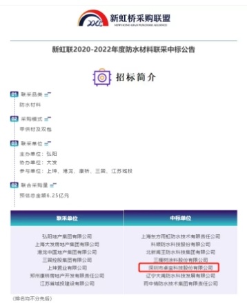 本次招標以甲供材及雙包的采購模式采購預計采購總金額為6.25億元的防水材料。聯采單位有弘陽地產集團有限公司、上海大發房地產集團有限公司、港龍中國地產集團有限公司、三巽控股集團有限公司、上坤置業有限公司、鄭州康橋房地產開發有限責任公司、江蘇省城投建設有限公司等。