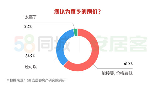 58同城、安居客調研顯示,在外打拼的人群中,有61.7%的人表示家鄉的房價能夠接受,價格相對較低,僅有3.4%的人認為家鄉的房價過高。相對來講,回鄉買房的壓力會更小些。