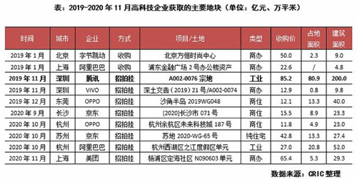 據克而瑞不完全統計,2020年以來至11月,包括字節跳動、阿里巴巴、華為、京東等10家高科技企業共在土地市場投資超240億元,涉及土地面積376萬平米,折合建筑面積773萬平米;而2019年該10家企業的投資額更是高達235億元,涉及建筑面積1021萬平米。