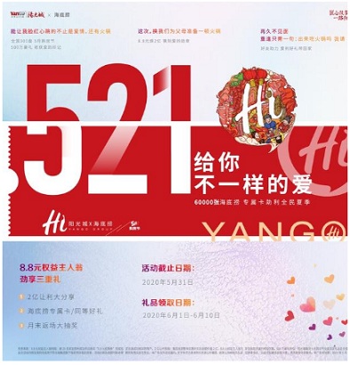 5月下旬,跨界聯名海底撈,打造了"521給你不一樣的愛"的主題活動,60000張海底撈專屬卡為全國項目提供更大的銷售支持,整體活動實現超20億的業績。