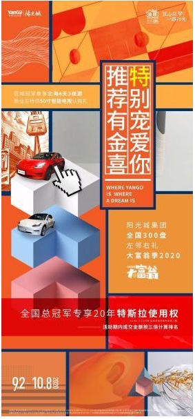 9月份,全國300盤聯動,借助陽光房寶平臺打造"左鄰右禮業主月",營銷、客關、物業等三大部分聯動為全國的100萬業主定制豪禮。