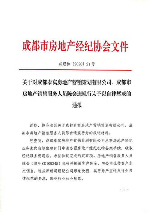 12月2日,四川省成都市房地產(chǎn)經(jīng)紀協(xié)會官網(wǎng)通報了對成都泰窩房地產(chǎn)營銷策劃有限公司、成都市房地產(chǎn)銷售服務(wù)人員陳某違規(guī)行為予以自律懲戒。