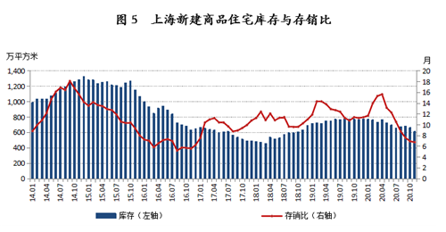 截至2020年11月底,上海新建商品住宅庫存為613萬平方米,環比下降7.6%,同比下降20.0%。存銷比方面,11月上海新建商品住宅存銷比為6.8個月。觀察數據可知,自2020年5月以來存銷比呈現不斷下降的態勢,這主要是由于國內疫情不斷好轉,上海房地產市場也逐漸復蘇。今年5-7月一直出現新房供不應求的局面,導致庫存面積不斷下降,存銷比也隨之持續降低。8-9月新房供應量大幅增加,一定程度上緩解了前幾月供不應求的局面。10月供應量縮減明顯,需求端依然強勁,因此再一次出現了供不應求的情況,存銷比也進一步下降。11月供應量稀少,,但仍幾倍于供給端,供不應求的情況加劇,存銷比繼續下降。