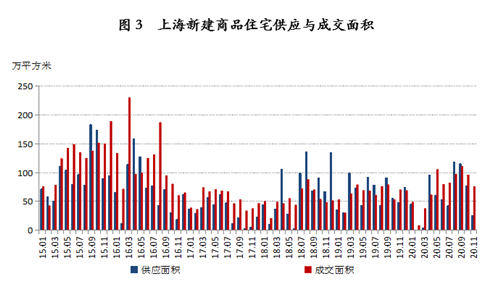 11月,上海新建商品住宅成交面積約75.9萬平方米,環比下降20.8%,同比增長8%,成交量較10月有所下降;新增供給面積25.8萬平方米,環比下降66.4%,同比下降46.7%。