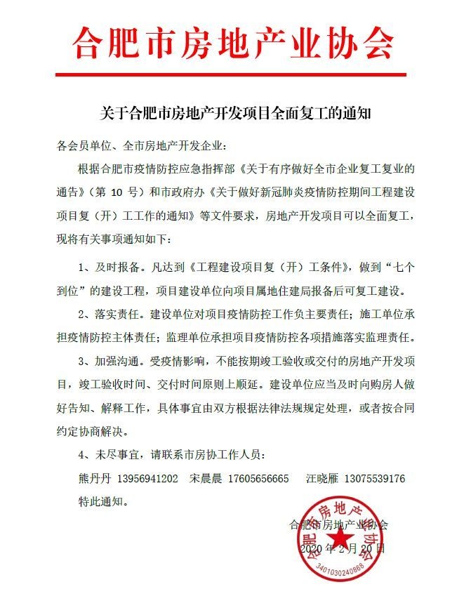 房訊網訊:2月20日晚,合肥市房地產業協會發布關于合肥市房地產開發項目全面復工的通知