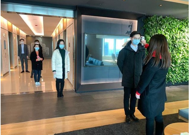 在恒隆廣場(chǎng)2座42樓辦公的戴德梁行目前已經(jīng)復(fù)工。據(jù)公司相關(guān)負(fù)責(zé)人介紹,目前公司采取分批次上班的方式,每天為每位到崗員工發(fā)放一個(gè)口罩,并配有酒精、消毒液等各種防疫用品。《華夏時(shí)報(bào)》記者看到,在兩次測(cè)量體溫之后,員工進(jìn)入戴德梁行之前還需再次測(cè)量體溫。