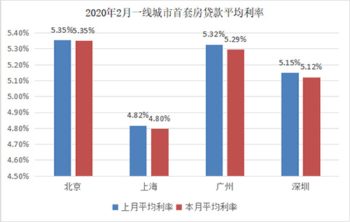 2020年2月,除北京外,另外三個城市首套房貸款利率再次下降。廣州和深圳均環比下降3個BP,上海則環比下降2BP,下調后首套房貸利率再創新低,僅4.80%,和對應期限的5年期LPR水平一致。