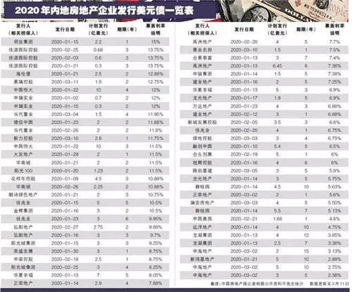 據記者不完全統計,截至3月11日,2020年內地房地產企業發行美元債筆數超過60筆,合計發行規模約196億美元,包括融創中國、龍湖集團、恒大、碧桂園在內的多家房企均公告發行美元債。其中,單筆發行規模最高的是中國恒大發行的兩筆10億美元規模的債券,發行單筆美元債票面利率最高的是明發集團,發債利率高達15%。