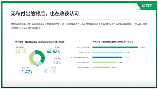 一直以來,鏈家都致力于扎根社區、服務社區,充分發揮門店的資源優勢,以多種多樣的便民服務項目助力居民生活。調研結果顯示,提供社區服務獲得了大多數鏈家經紀人的肯定,88.1%的經紀人認為社區便民助民及公益活動對自己的職業發展有幫助,其中最大的幫助是增加了經紀人的社會認同感。持續向社區提供價值,也在讓經紀人收獲更多的社會認可。