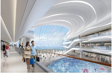 有幾個比較代表性的項目,比如海南的恒大海花島國際購物中心。提及海南,我們總會想到黎族、椰子、海風、陽光等元素,但是這個商業中心定位是國際免稅商業購物城,基于此,我們將其定位趨于簡約風雅,構筑成一個非常國際化的空間。