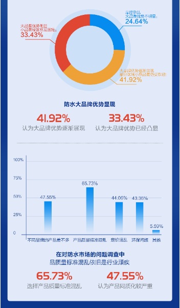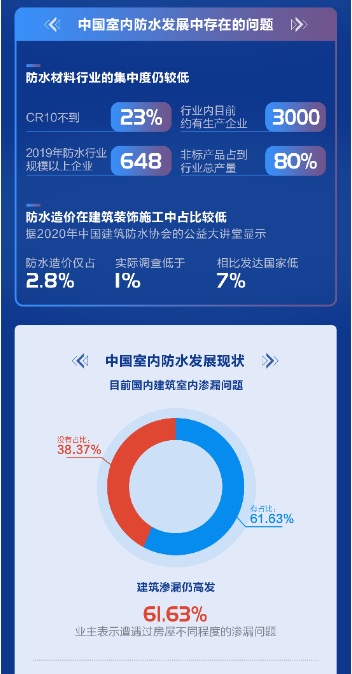 防水白皮書1.0的關鍵詞是“關注”,而2.0版本聚焦的則是蓬勃“發展”中的行業。隨著消費者的防水意識逐漸提升,以及各地存量房翻修、基礎建設發力,防水行業得到了快速發展。但同時,它還仍處于一個規模小、產業集中度低、市場競爭不規范的不成熟階段。這是現狀,也是機遇!