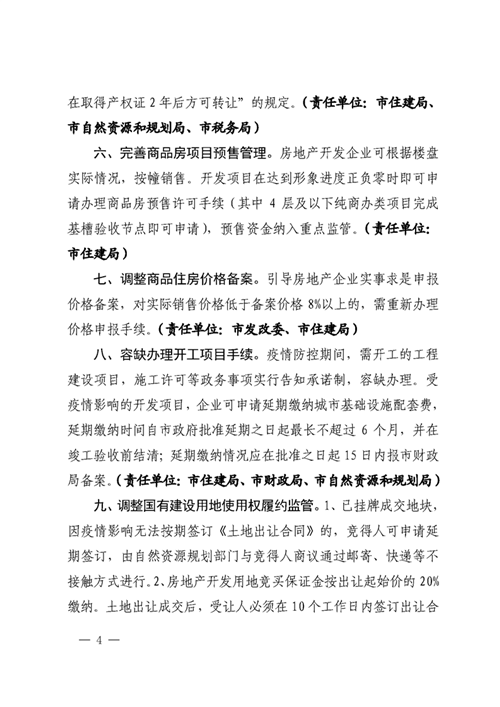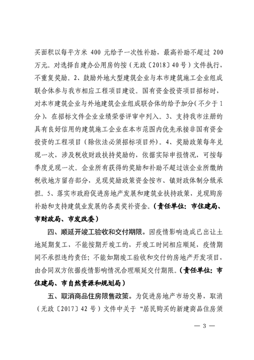 房訊網訊 據媒體報道,安徽省無為市日前印發了《關于應對新冠肺炎疫情防控促進建筑業和房地產業健康有序發展的通知》,取消該市2017年相關文件中2年限售的規定,同時調整商品住房價格備案政策,并完善推出建筑業扶持政策,兌現獎補資金等。