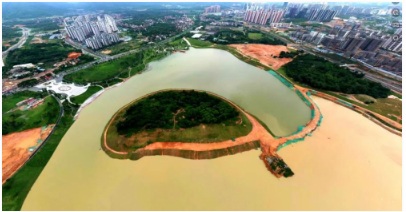 暴雨襲擊下,知識城鳳凰湖湖水渾濁不堪。而在建中的九龍湖,經一夜暴雨后水位大漲,現已蓄滿,連觀光連廊也已淹沒。九龍湖湖中小島及過島通道,將湖水隔成了兩個世界,涇渭分明:南側較清,北側渾濁,儼然一副太極圖。