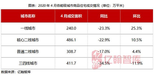 據億翰智庫分析報告,從監測的40城數據來看,4月全國商品住宅銷售面積為1446.5萬平米,同比下跌25.6%,與上月持平,環比上漲3.7%,4月住宅市場繼續保持回暖態勢。