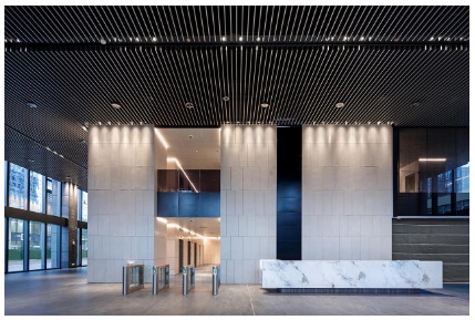 大廳的整體布局簡約大方,線條感與棱角感更加凸顯了設計的簡潔與大氣。在采光良好的前提下,大廳還采用了射燈的照明方式,非常符合現代辦公樓發展的共同趨勢,節能環保,綠色生態。