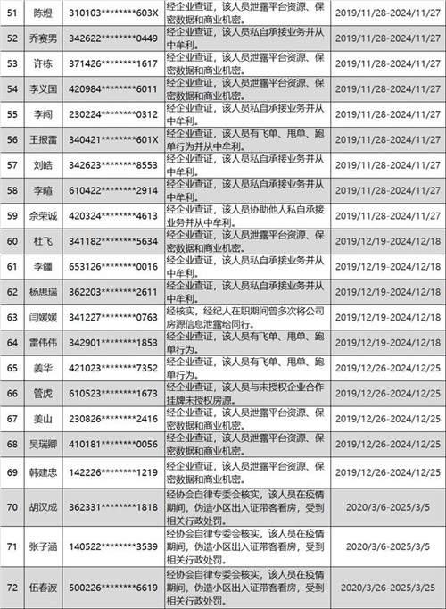 從名單來看,上述72人不良行為包括:飛單、甩單、跑單;私自承接業務并從中牟利;泄露平臺資源、保密數據和商業機密;私下向客戶索要好處費;疫情期間偽造小區出入證帶客看房,受到相關行政處罰等。