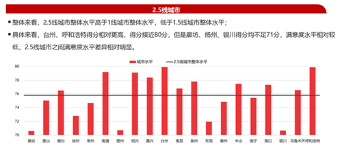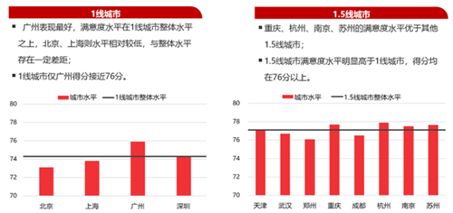 而1.5線城市滿意度水平明顯高于1線城市,得分均在76分以上,而一線城市中僅廣州得分接近76分。