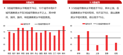 三線城市整體水平略高于76分,13個城市中有6個城市滿意度水平在三線城市整體水平之上,其中、柳州、湖州、滁州、阜陽滿意度水平明顯更高。