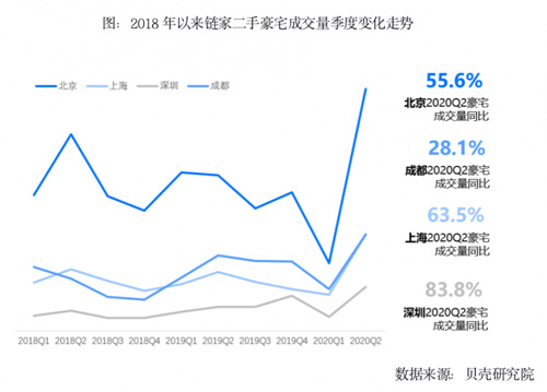 進(jìn)入二季度,疫情影響減弱疊加貨幣政策寬松影響,前期積壓的改善型需求集中釋放,重點(diǎn)城市豪宅市場強(qiáng)勢反彈,走出了V型曲線態(tài)勢。具體來看,二季度北京豪宅市場成交量同比增加55.6%,上海豪宅成交量同比增加63.5%,深圳豪宅成交量同比增加83.8%,成都豪宅成交量同比增加28.1%,北上深蓉二季度豪宅成交量均創(chuàng)下2018年以來季度新高。
