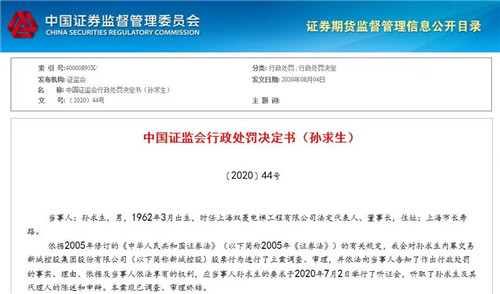 據(jù)證監(jiān)會(huì)官方網(wǎng)站消息,8月4日,證監(jiān)會(huì)發(fā)布〔2020〕44號(hào)行政處罰決定書(孫求生)。決定書顯示,與新城控股實(shí)際控制人王振華認(rèn)識(shí)十幾年的上海雙菱電梯工程有限公司法定代表人、董事長(zhǎng)孫求生在獲知王振華猥褻兒童事件后突擊賣出持有的50000股新城控股股票。
