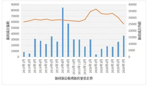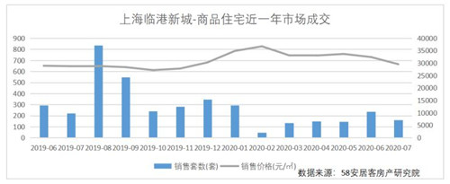 按照58安居客房產研究院數據,2019年8月受自貿區政策影響,臨港新房單月銷售套數達835套,而后銷量持續回落,至2020年2月達到最低點。到今年二季度,市場整體復蘇推動下銷量有了一定恢復,但今年最高單月銷量僅235套,依然低于去年8月-12月的最低銷量。同時新房價格也呈現沖高回落,今年7月均價跌破3萬元/平方米大關。