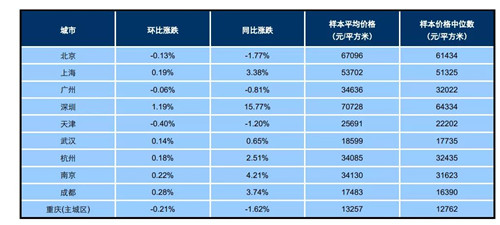 包括一線城市在內(nèi)的十大城市,也有4個出現(xiàn)環(huán)比下跌。降幅最大的為天津,環(huán)比下跌0.40%。重慶(主城區(qū))、北京緊隨其后,跌幅分別為0.21%和0.13%。廣州也有微跌,為0.06%。