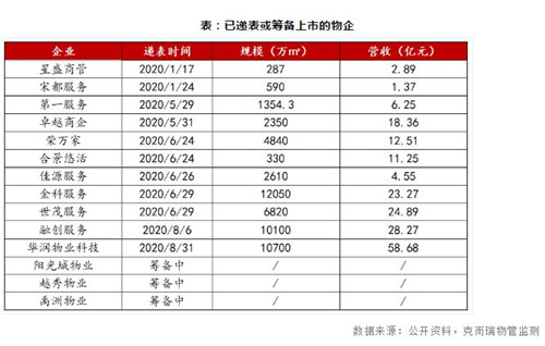 據(jù)克而瑞物管監(jiān)測(cè),尚有14家物企已遞表或處于籌備中,包括世茂服務(wù)、融創(chuàng)服務(wù)、華潤物業(yè)科技等頭部開發(fā)商。