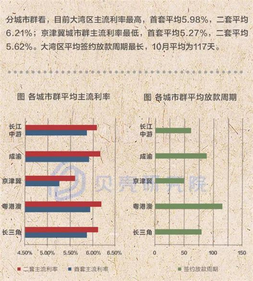 分城市群看,目前大灣區主流利率最高,首套平均5.98%,二套平均6.21%;京津冀城市群主流利率最低,首套平均5.27%,二套平均5.62%。大灣區平均簽約放寬周期最長,10月平均為117天。