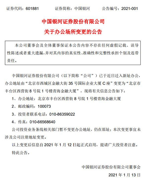 房訊網(wǎng)訊 1月13日,中國銀河證券股份有限公司發(fā)布公告稱,公司已于近日遷入新址辦公,辦公地址由“北京市西城區(qū)金融大街 35 號(hào)國際企業(yè)大廈 C 座”變更為“北京市豐臺(tái)區(qū)西營街8號(hào)院1號(hào)樓青海金融大廈。