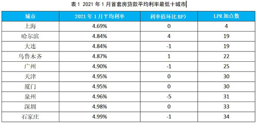 2021年1月,全國首套房貸款利率最低十城市名單未發生變化,泉州因下降5BP,排名從全國第十低變為第八低。全國首套房貸款利率前十高城市名單中,沈陽首套房貸利率環比下降2BP,跌出全國前十高,長順位進入名單。